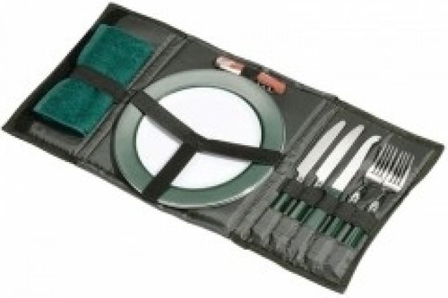 Jídelní set pro dvě osoby v praktickém pouzdru. Set obsahuje: 2 jídelní talíře, 2 nože a 1 nůž s příslušenstvím, 2 vidličky, 1 Víceúčelový nástroj, 1 ručník. Praktický pomocník při přípravě jídla na rybářských výpravách.