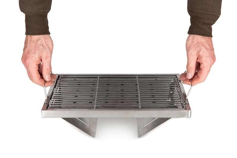 Rozlkládací gril z nerezové oceli. Skvělý parťák pro Váš pobyt uvody. Kompaktní velikost se snadno vejde do vašeho vybavení. Snadno sestavitelný – rozloží se a umístí na místo. Grilovací plocha – 34 x 23 cm. Složené rozměry – 38 x 26 x 3 cm. Dodáván s obalem na zip.